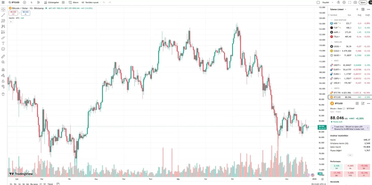 Bitcoin, geçtiğimiz günlerde 86.500 dolar seviyelerine kadar gerileyerek son dönemin en düşük bölgelerinden birini test etti. Bu seviyeden gelen alımlarla birlikte fiyat, yeni günde 87.900 dolar seviyelerine kadar yükseldi.