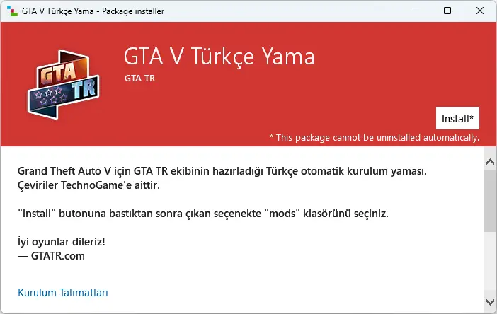 GTA TR ekibinin hazırladığı kurulum, TechnoGame’in çevirilerini oyuna aktarma işlemini son derece basitleştirme amacıyla üretilmiştir. Önceden yalnızca manuel olarak kurulabilen dil dosyaları, artık otomatik bir şekilde oyuna aktarılabiliyor. Oyuna sonradan gelen güncellemeler nedeniyle uyumsuzluk oluşması durumunda veya yamanın daha verimli çalışması amacıyla yama güncellenerek yeni versiyonları yayınlanabilir. Yama, oyunun güncel sürümünde sorunsuz çalışması için gerek görüldüğünde güncellenebilir. Oyuna sonradan eklenen yeni metinlerin çevirileri ve bazı imla hatalarının düzeltilmesi/güncel olmayan çevirilerin düzenlenmesi gibi optimizasyonlar GTA TR tarafından yapılmaktadır. Güncelleme geçmişini sayfanın aşağısında bulabilirsiniz.