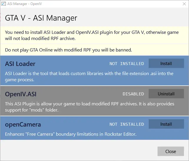 - OpenIV açıldığında, menüden Tools sekmesine gelip ASI Manager‘a tıklayın. Açılan pencerede ASI Loader ve OpenIV.ASI için Install tuşuna tıklayarak ikisini de kurun, onay penceresi çıkarsa onaylayın.