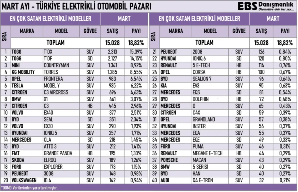 📊 Mart 2026 En Çok Satan Elektrikli Otomobiller